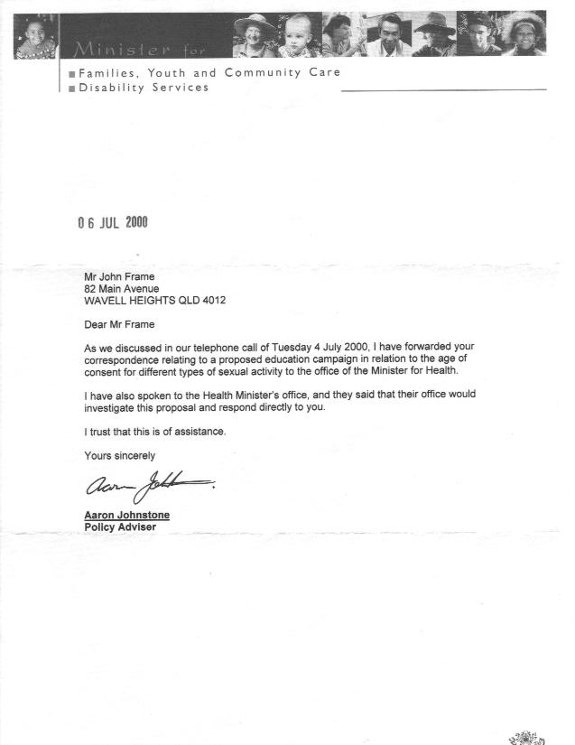 As we discussed in our telephone call of Tuesday 4 July 2000, I have forwarded your correspondence relating to a proposed education campaign in relation to the age of consent for different types of sexual activity to the office of the Minister for Health.