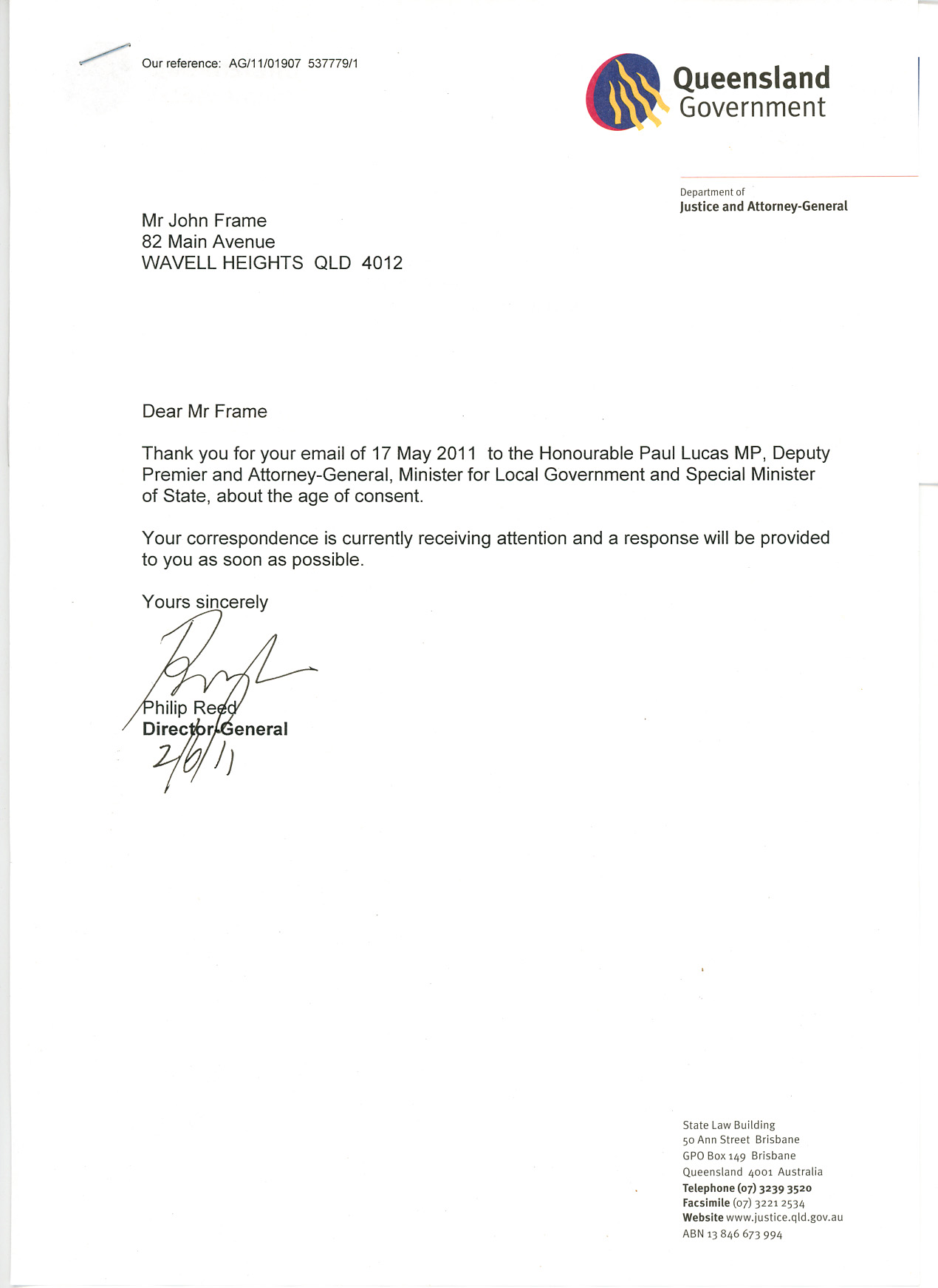 Director-General of the Department of Justice and Attorney-General, Philip Reed. In response to my 17th May 2011 email to the Attorney-General and the