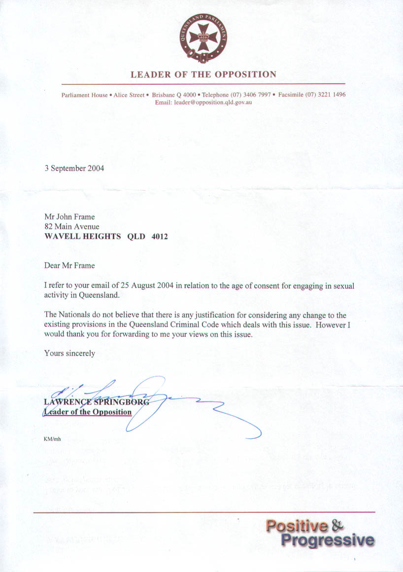 September 2004 Letter from Opposition Leader, Lawrence Springborg, in response to my 25th