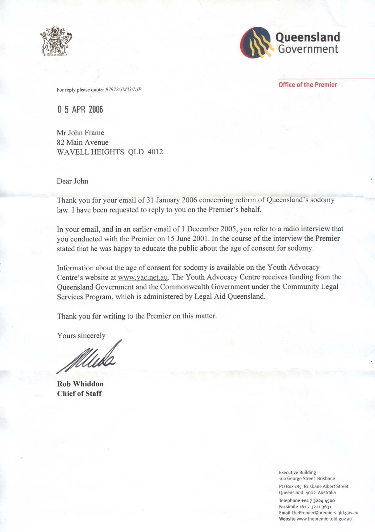 Thank you for your email of 31 January 2006 concerning reform of Queensland's sodomy law. I have been requested to reply to you on the Premier's behalf.