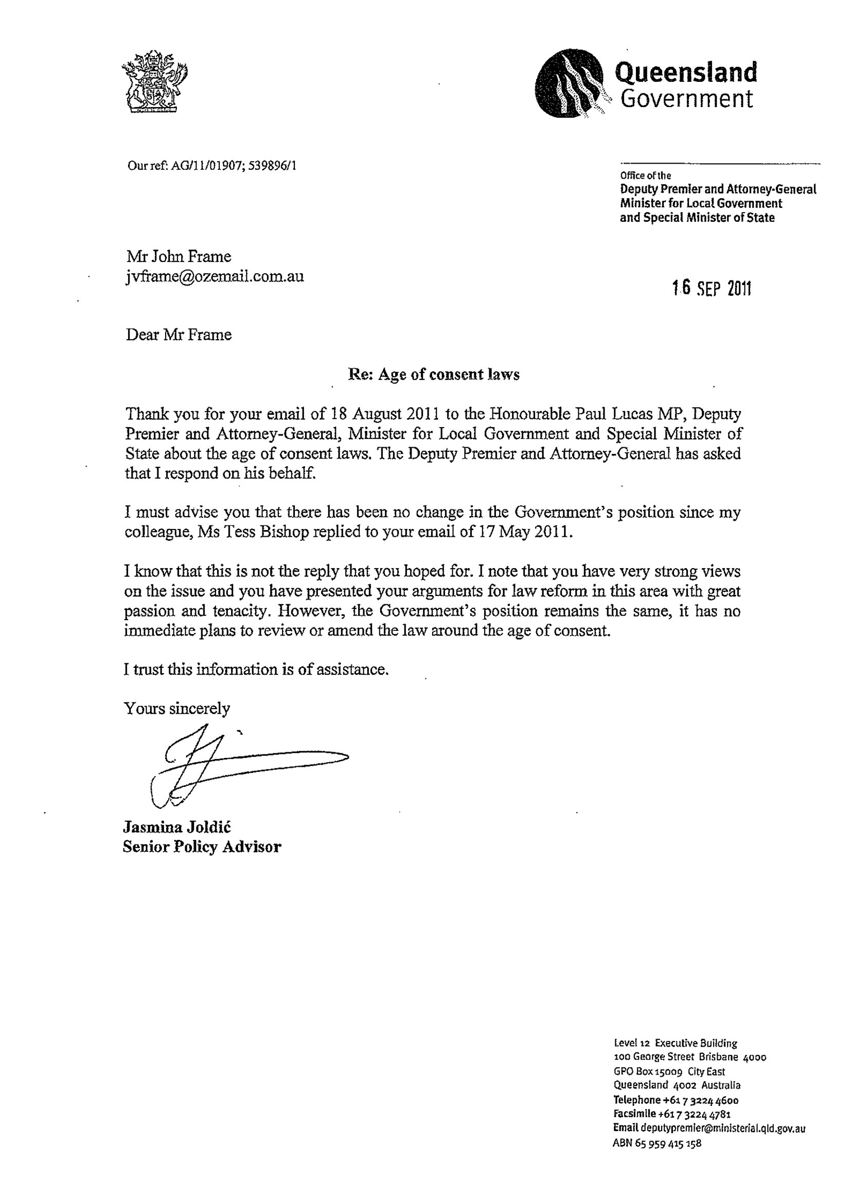 16th September 2011 Letter from the Office of Attorney-General Paul Lucas. This letter was received as a pdf file attachment to a 26th September 2011