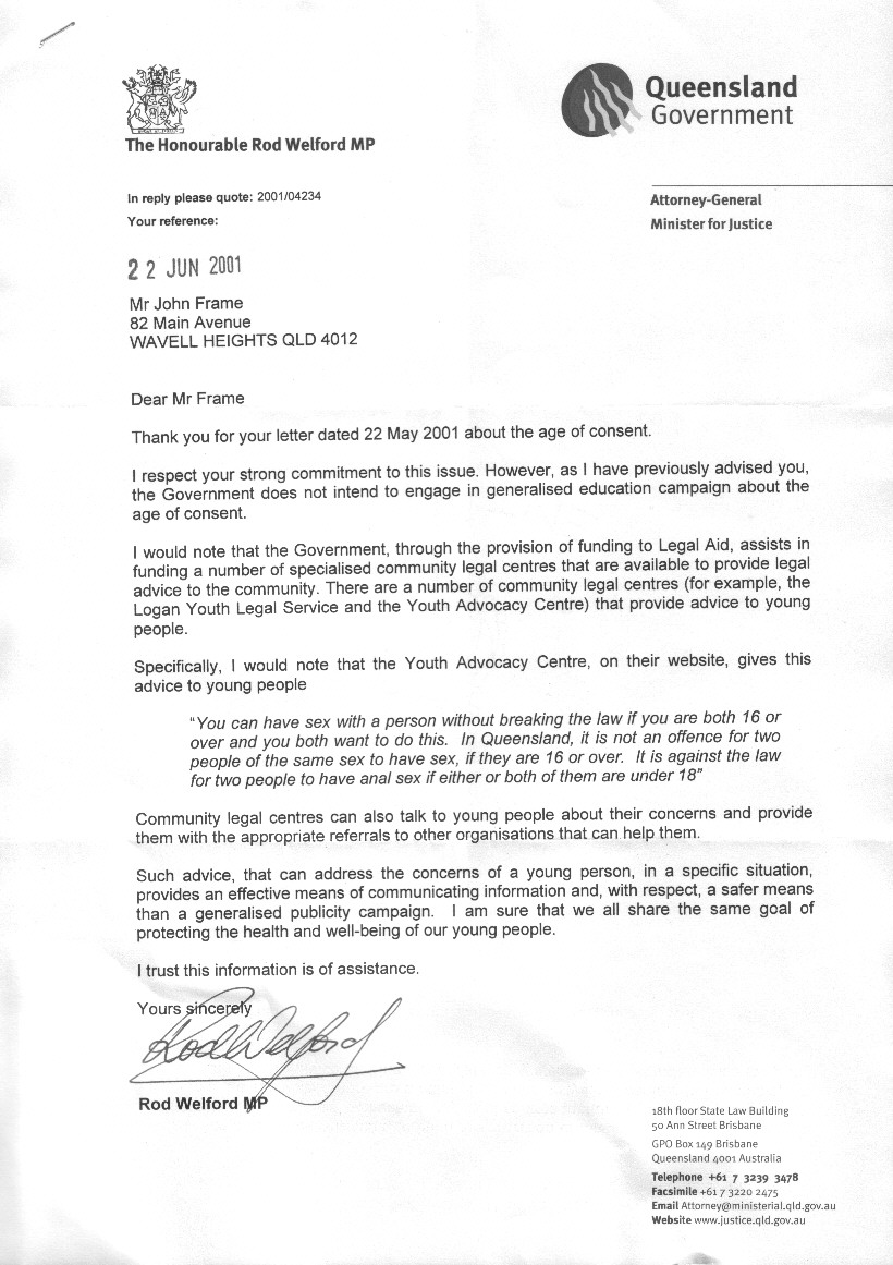22nd June 2001 Letter from Attorney General Rod Welford, in reply to my letter of 22nd May 2001. He again declines to do anything to further inform any agency or the public. He claims that it is sufficient that youth can contact a few existing legal centres (which may or may not have access to correct information) and one unofficial website (with recently corrected information).