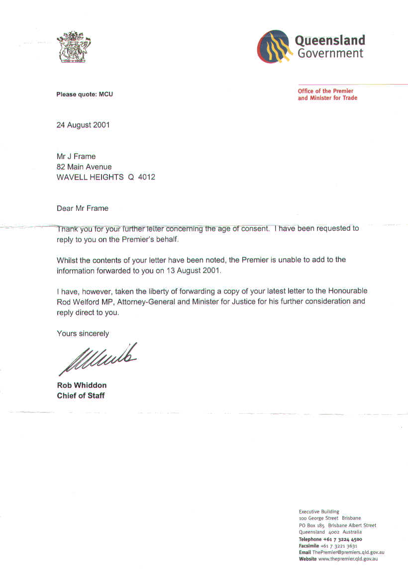 Thank you for your further letter concerning the age of consent. I have been requested to reply to you on the Premier’s behalf.