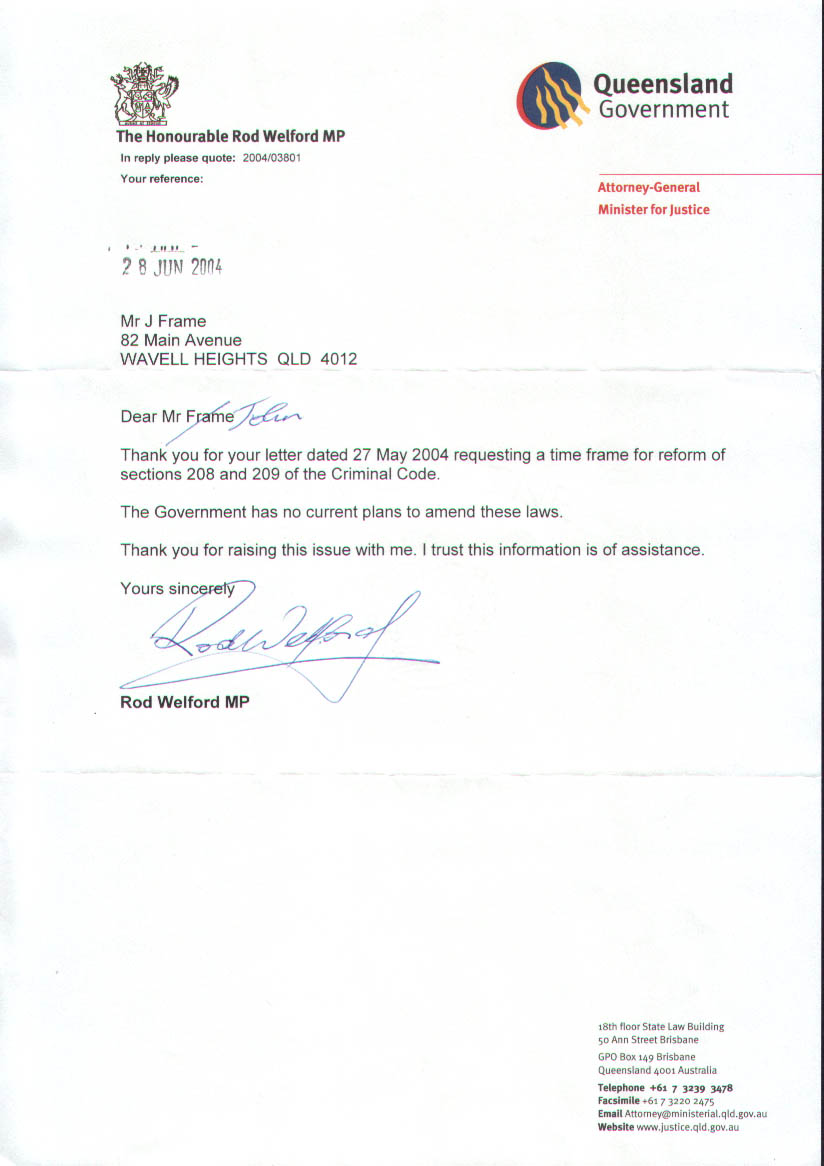 28th June 2004 Letter from Attorney General Rod Welford, in response to my 27th May 2004 letter. Mr. Welford states that the Queensland Government has no plans (and therefore no time frame) for reform of the Sodomy Law. The state of New South Wales equalised its age of consent at 16 in mid 2003 and Northern Territory did the same in late 2003. The next Queensland election will be in 2007. The Beattie Government may be deliberately dragging its feet on this reform until after the impending Federal election, because several marginal seats are in rural Queensland. If so that is an inexcusable abuse of political power at the expense of the health and well being of our state’s youth.