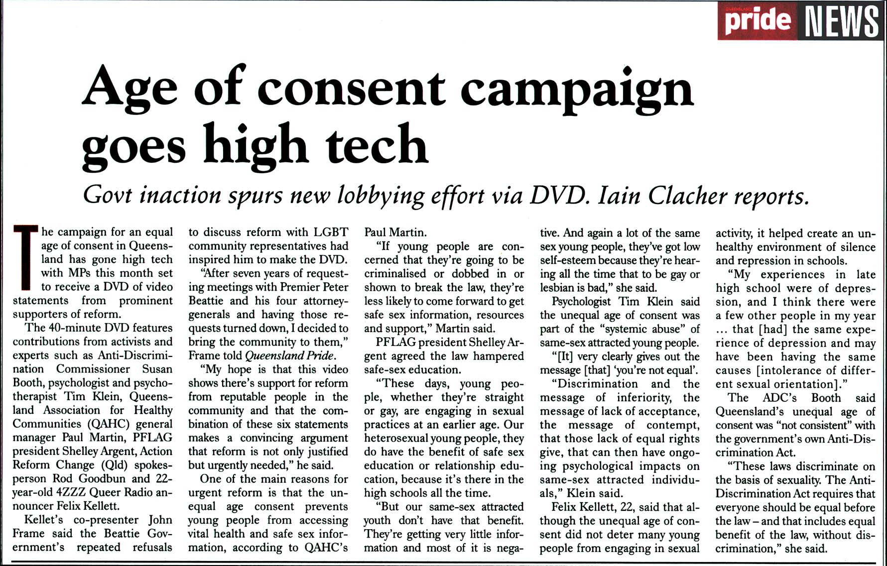 June 2007 edition Page 3 “Pride News”: Age of consent campaign goes high tech Govt inaction spurs new lobbying effort
